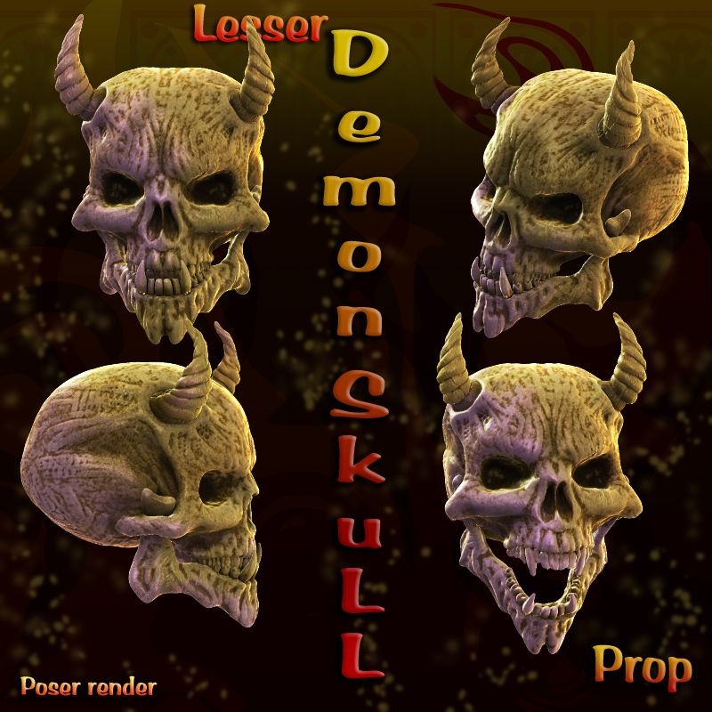 This is a skull from a Lesser Demon from the pits of Hell. Due to popular demand, it has been reworked to be used in Poser with ease! This demon skull is a prop and the bottom jaw has been parented so it rotates open and closed. Don't leave HELL without it!
